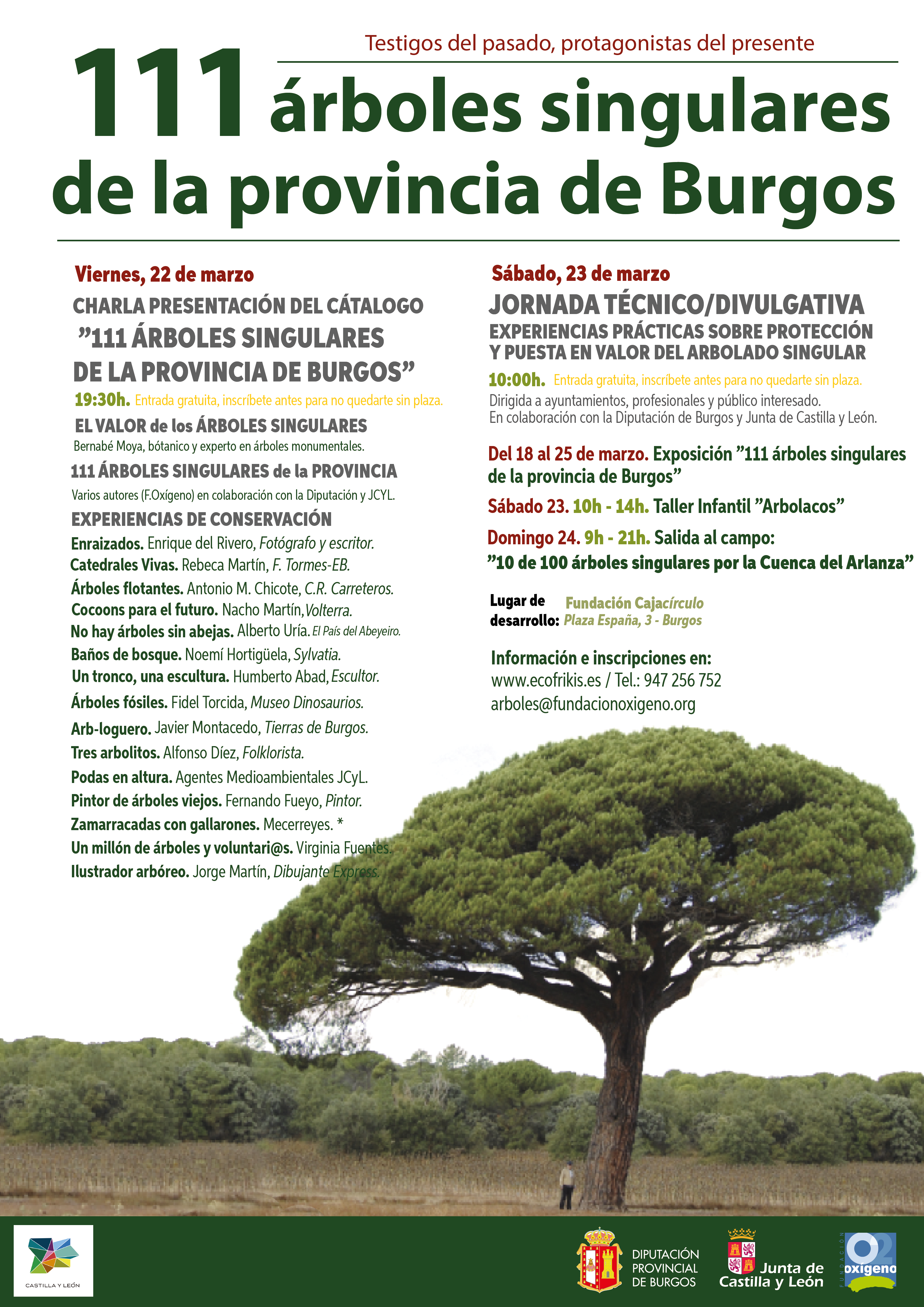 Con motivo de la edición y distribución del Catálogo de Árboles Singulares de la Provincia de Burgos, publicación incluida dentro de las actuaciones previstas en la II Estrategia de Educación Ambiental de Castilla y León 2016-2020 y subvencionadas por la Junta de Castilla y León, la Diputación Provincial de Burgos y la Fundación Oxígeno van a desarrollar una serie de actividades de educación y sensibilización ambiental destinadas a dar a conocer este Catálogo y a sensibilizar a diferentes sectores de la población sobre la importancia de conocer y conservar los árboles de nuestro entorno. Entre estas actividades, que se desarrollarán en el marco de la celebración del Día Internacional del Árbol 2019, y cuyo programa se adjunta, se encuentran las siguientes: