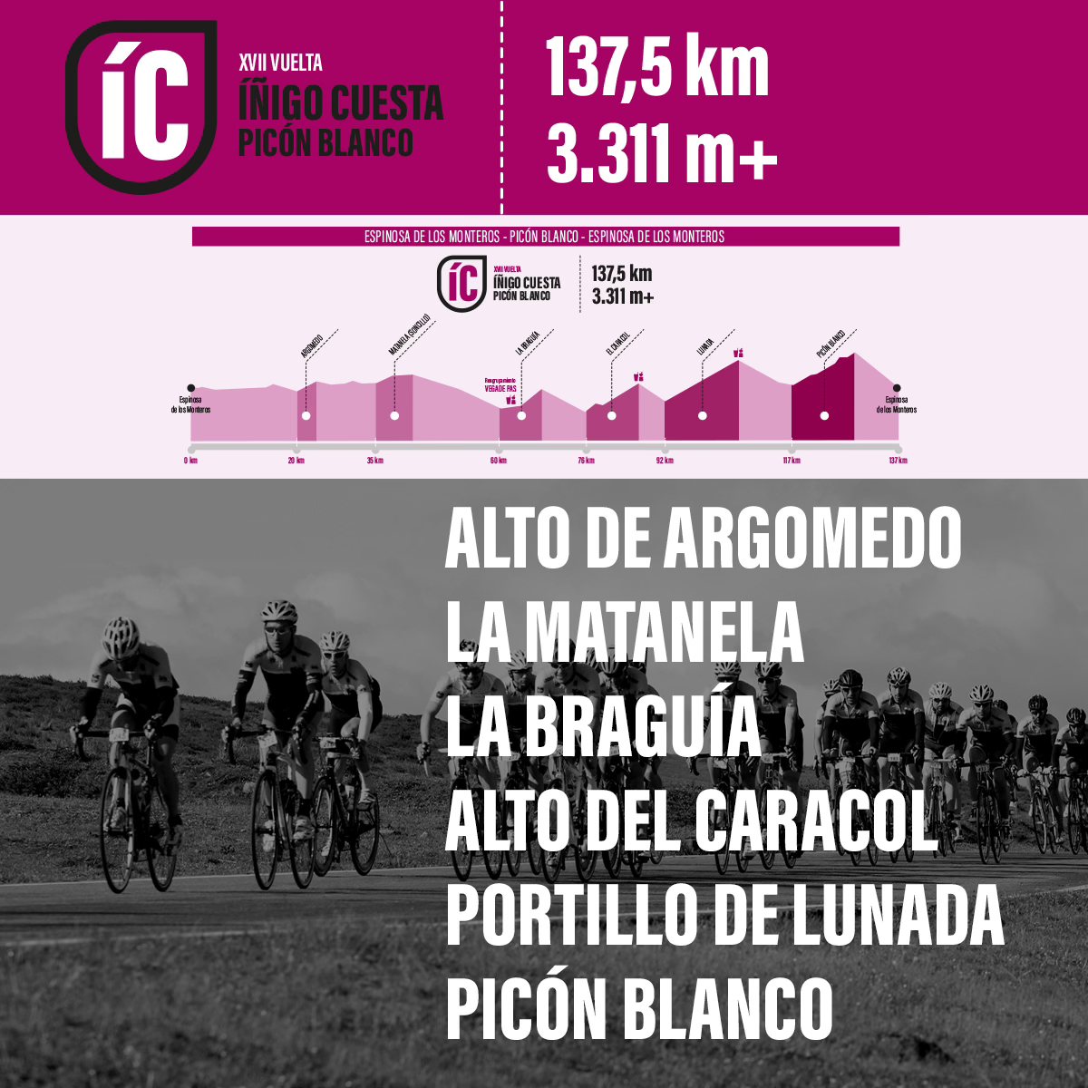La Vuelta Íñigo Cuesta llega a su 17 edición el próximo sábado 25 de mayo. Con inicio y final en Espinosa de los Monteros y con el mismo recorrido que el año pasado, que incluye el famoso Picón Blanco como colofón a las ascensiones a puertos de categoría mundial como El Caracol o Lunada. La prueba, que forma parte del Circuito Provincial de Cicloturismo, quiere convertirse en referencia a nivel europeo de las marchas cicloturistas con grandes desniveles acumulados.